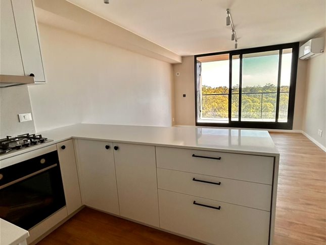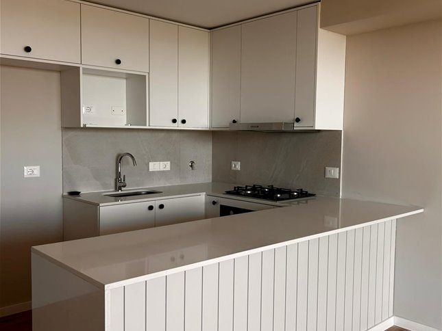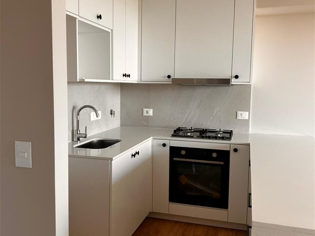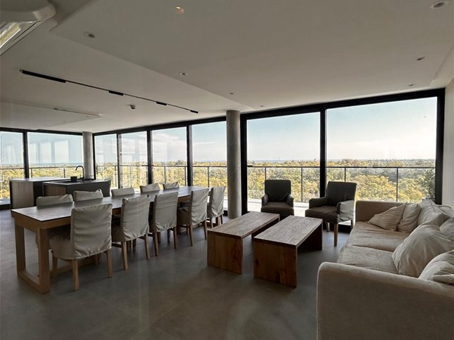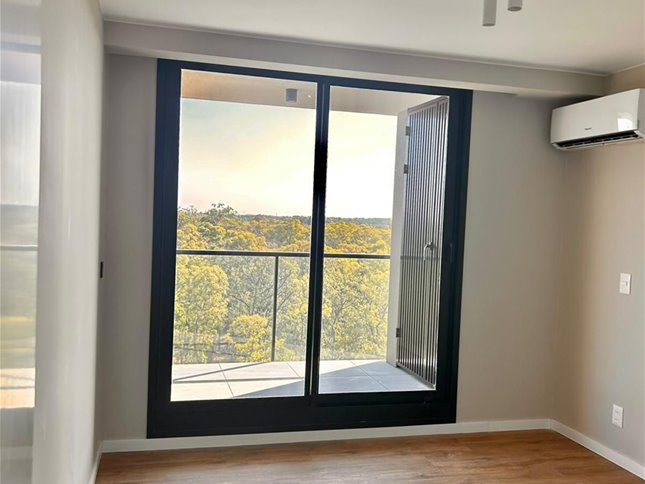 Apartamento en piso alto, muy luminoso, con vista al Parque Roosevelt con amplia terraza. Living comedor con cocina integrada, equipada con muebles aéreos y bajo mesada, horno empotrado y anafe.